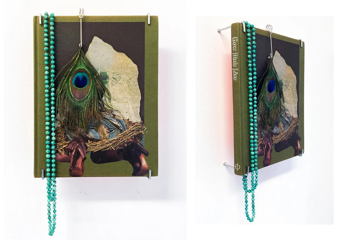 Book, collage, peacock feather, nappy pin, fluorescent paper, nylon, necklace and hooks